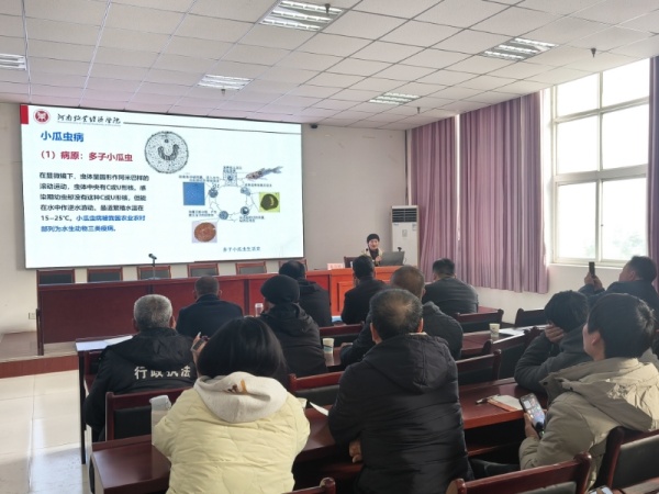 12月26日,應舞鋼市畜牧業(yè)發(fā)展中心邀請,動物科技學院副院長秦改曉受邀參加舞鋼市2025年水產(chǎn)優(yōu)良品種引進繁育和示范推廣培訓活動,以“魚類健康養(yǎng)殖與病害防控”為主題做專題報告,為當?shù)厮a(chǎn)從業(yè)者送上精準實用的技術大餐。