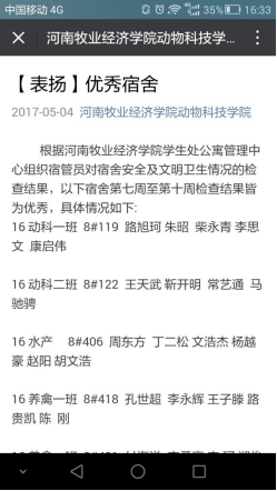 宿舍是同學(xué)們的溫馨港灣,宿舍的精神面貌與學(xué)生的人格培養(yǎng)息息相關(guān)。為營造文明、整潔的宿舍環(huán)境,優(yōu)化育人環(huán)境,我院組織學(xué)生按照學(xué)校要求打掃宿舍衛(wèi)生,結(jié)合學(xué)校衛(wèi)生檢查情況學(xué)院定期對優(yōu)秀宿舍進(jìn)行表彰,對不合格宿舍進(jìn)行通報(bào)批評并責(zé)令整改。我院還在院系微信公眾平臺上發(fā)文,對4月份表現(xiàn)優(yōu)秀的宿舍進(jìn)行表揚(yáng),推送了宿舍衛(wèi)生簡報(bào),按優(yōu)秀率對班級宿舍情況進(jìn)行排名。在今后的工作中,我院將對學(xué)生宿舍精神文明建設(shè)實(shí)行規(guī)范化、制度化管理,在日常管理中加強(qiáng)學(xué)生的思想政治教育,促進(jìn)學(xué)生宿舍內(nèi)務(wù)衛(wèi)生管理,創(chuàng)建文明宿舍,促進(jìn)我院精神文明建設(shè),提升學(xué)生文明素養(yǎng)。